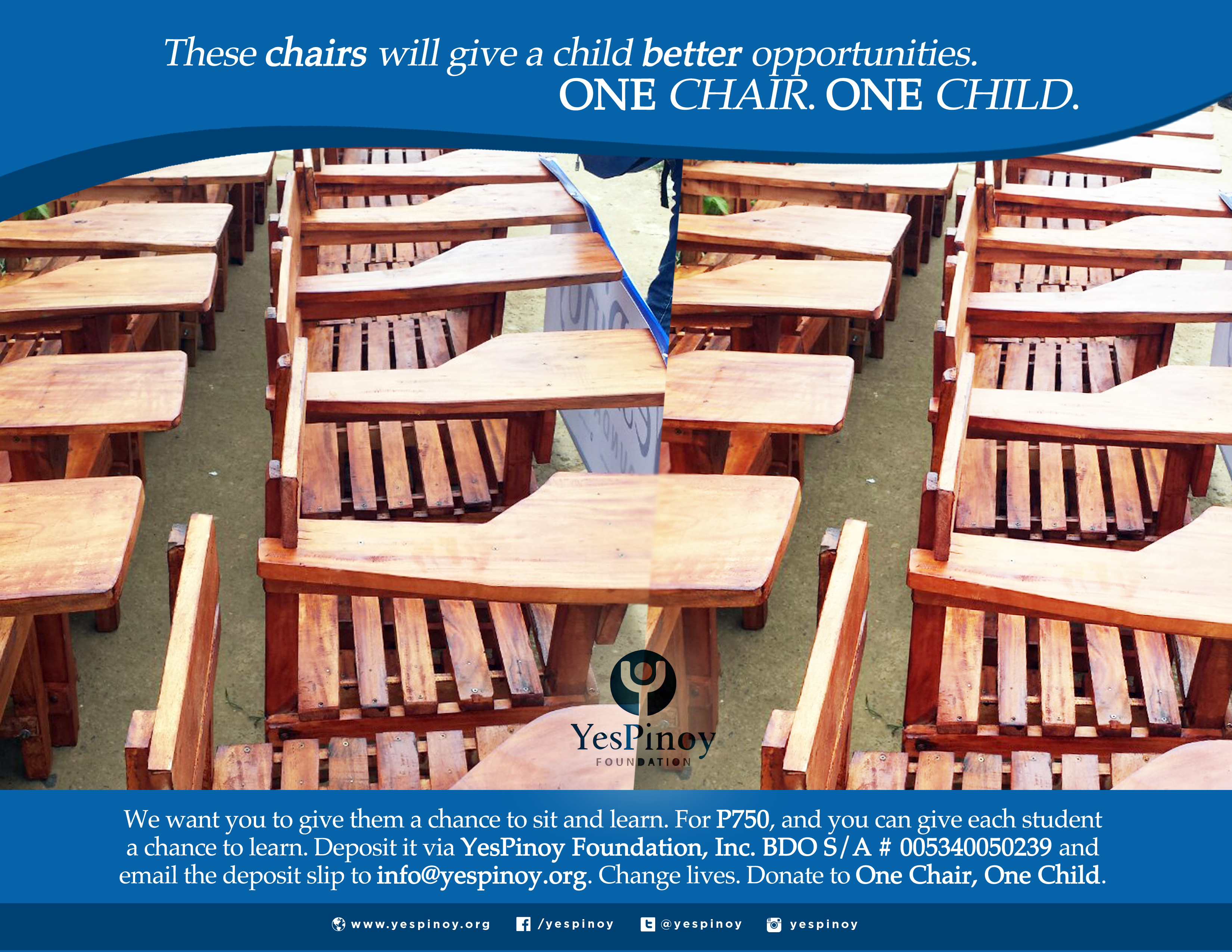 Who knows who’ll be sitting in these chairs one day? It could be a scientist who cures HIV/AIDS or a certain kind of cancer. It could be a peace-maker who solves our decades-long problems in Mindanao. It could even be a future President of the Republic of the Philippines. Education is the seat of the country’s future. What a privilege to be able to say, “I supported the seat of my country’s future!